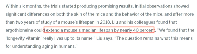 图注:与对照组相比,补充麦角硫因的小鼠平均生存年龄增加了21%
