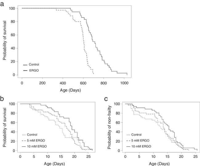 欧洲8国的人均EGT摄入量统计也显示,较低的麦角硫因摄入水平还与帕金森症的发病率以及预期寿命降低成正相关。日本金泽大学的实验则显示,接受EGT补充的小鼠不仅平均寿命延长21%。90%个体的死亡时间还延后了29%,并能显著延缓随年龄增长的运动机能衰退,学习和记忆能力丧失等问题。