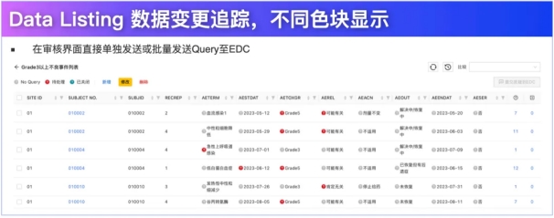 平台可快速生成定制化的医学监查数据审核表。研究人员可直接在列表上查看和跟踪数据,操作痕迹全程记录,增强了监管合规性。仅此一项,就为数据管理及编程团队节省了大量数据处理时间。