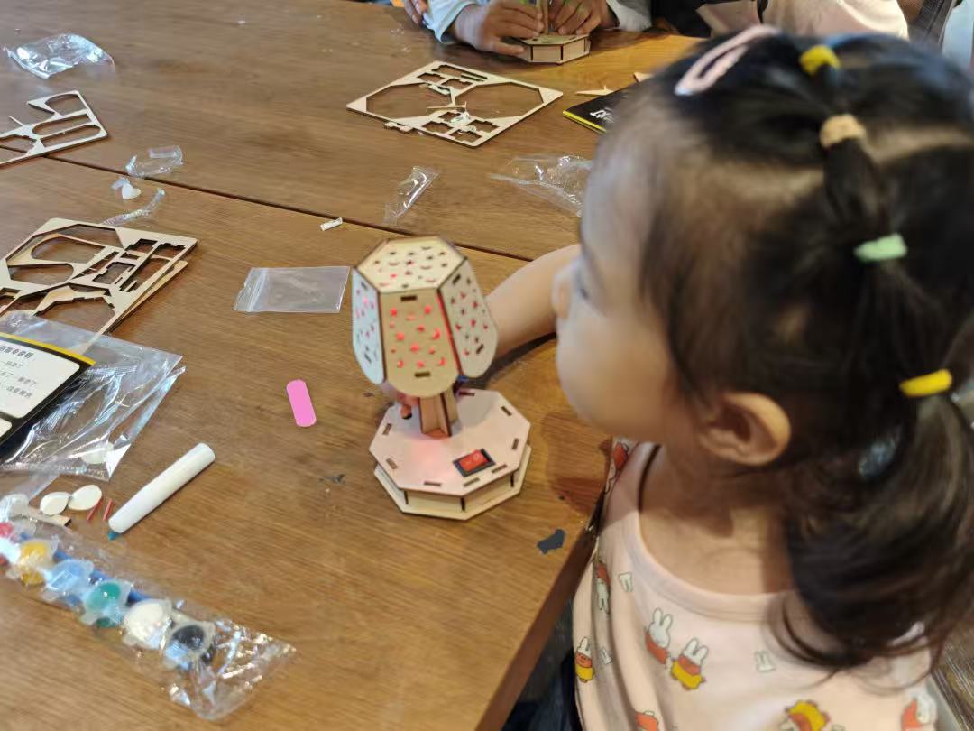 健康知识科普告一段落,充满趣味的亲子手工环节随即开启。工作人员为每组家庭发放了“声控小夜灯”手工材料包,让大家在活动中既动脑又动手。随着一个个小夜灯逐渐成型,活动室里响起了此起彼伏的指令声:“开灯!”“换颜色!”“关灯!”当五彩的灯光在指尖亮起,孩子们的脸上绽放出灿烂的笑容。