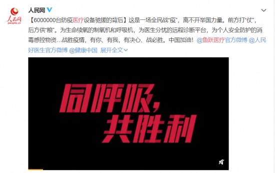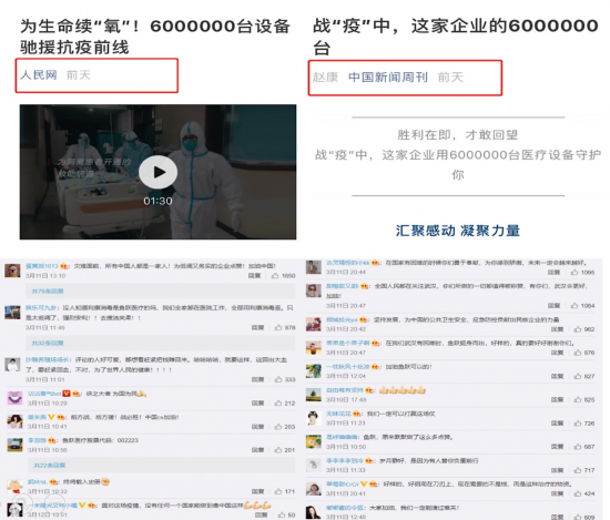 3月11日,人民网发布了一条鱼跃医疗争分夺秒,日夜兼程驰援疫情的纪录片,并评论称:【6000000台防疫医疗设备驰援的背后】这是一场全民战“疫”,离不开举国力量。前方打“仗”,后方供“粮”。为生命续氧的制氧机和呼吸机,为医生分忧的远程诊断平台,为个人安全防护的消毒感控物资…战胜疫情,有你、有我,有决心、战必胜。中国加油!。