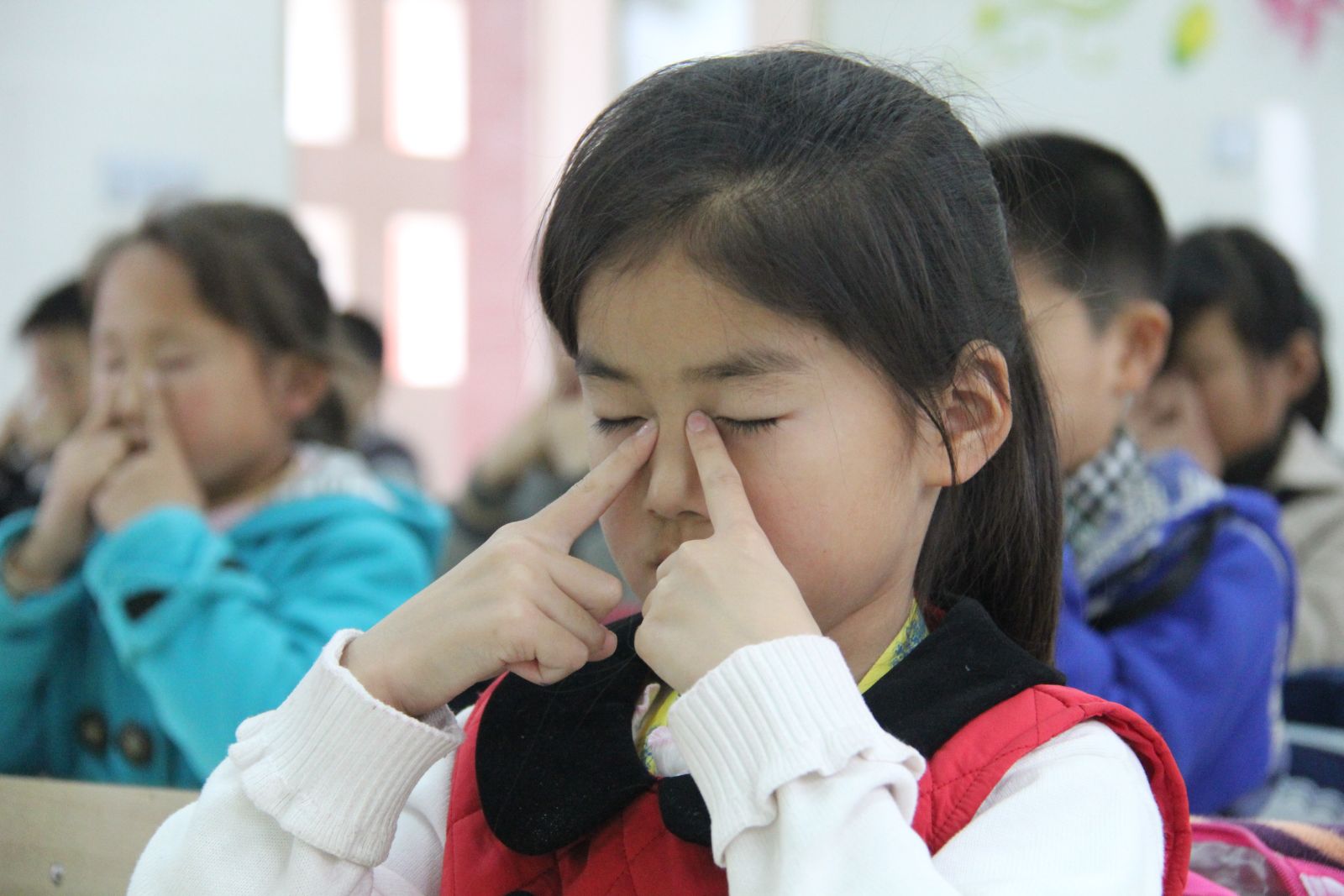 (1)双目自然闭合(2)揉睛明穴(3)揉太阳穴(4)揉四白穴(5)揉风池穴