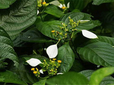 【原形态】大叶白纸扇,直立或藤状灌木,高1.3-2m。小枝圆形,被柔毛。叶对生;叶柄长1-3.5cm,有毛;托叶卵状披针形,长 8-10mm,先端常2裂;叶片宽卵形或宽椭圆形,长10-25cm,宽5-12cm,先端近突渐尖,基部楔形,两面脉上被疏柔毛,侧脉约9对,叶膜质或薄纸质。聚伞花序顶生;苞片托叶状,长约8mm;花5数,具梗;萼筒陀螺状,长约4mm,裂片披针形,长达1cm,宽2-2.5mm,外被短柔毛,其中一片扩大成叶状,倒卵形,长3-4cm,宽1.5-2cm,白色;花冠黄色,长约1.4cm,裂片卵形,长约2mm,里面有污黄色粉末状绒毛;雄蕊着生于花冠筒中部;子房下位,2室,柱头压扁状,2裂。浆果近球形,直径约1cm。花期6月,果期9月。