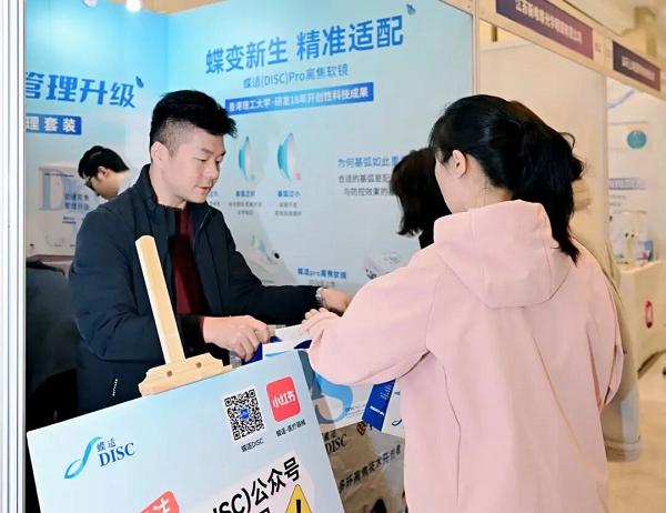 蝶适此次展出了品牌全家族产品矩阵,涵盖四大核心产品线:蝶适(DISC)离焦软镜、蝶适(DISC)pro离焦软镜、蝶适美离焦镜片、蝶适近视管理套装。