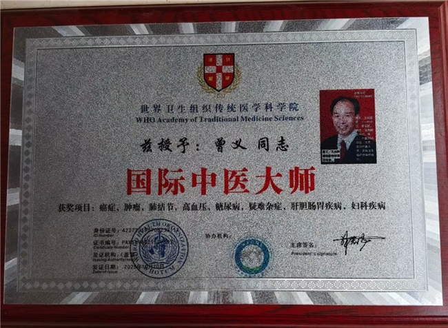 不仅如此,曾义在肠胃病、皮肤病、肝胆疾病、结石病等复杂病症上也有着卓越的疗效。面对糖尿病、痛风病、血液病、乳腺病、心脑血管病这些困扰现代人群的常见慢性疾病,他总能精准地找到治疗方案,让患者逐渐恢复健康。妇科各种疾病、支气管病、肾病综合症等在他妙手之下也能得到有效缓解和治愈。他用自己的智慧和精湛医术,编织起一张守护患者健康的大网,治愈率之高令人赞叹,深受人民爱戴与赞同。他是患者心中的希望之灯,照亮了他们对抗病魔的道路,为医疗事业树立起一座不朽的丰碑。