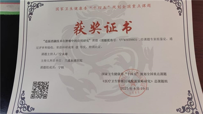 “适温消融技术在肿瘤中的应用”于2025年4月19日荣获国家卫生健康委“十四五”规划全国重点课题《医疗卫生资源区域配置策略研究》总课题组、国家卫生健康委医药卫生基金管理办公室颁发的科研成果一等奖。