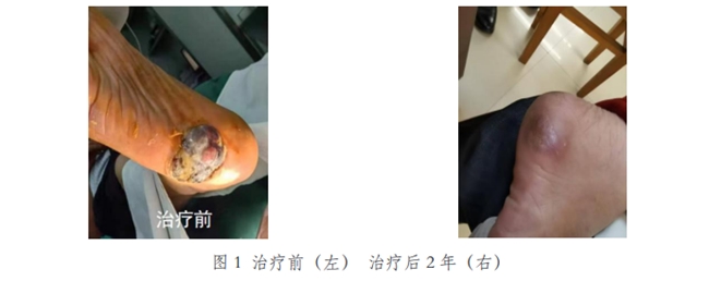 3.2 典型病例疗效 上述 4 例经超高温适温消融术后治疗效果如下。病例 1:右足跟恶性黑色素瘤术前右足跟 3.5cm×3.0cm 黑色破溃创面,疼痛明显,行走受限。2021 年5 月15 日,硬膜外麻醉后行超高温适温消融术,住院 4 天,术后 3 个月创面愈合,随访2 年,足跟形态正常(图 1),治疗总费用 4640.88 元。
