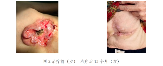病例 2:左乳腺浸润性腺癌左乳 8.5cm×6.5cm 溃疡型肿物,渗液伴恶臭。2024 年 5 月 21 日全麻后行超高温适温消融术,住院 8 天,治疗总费用 8727.28 元,术后 13 个月创面完全愈合(图2)。