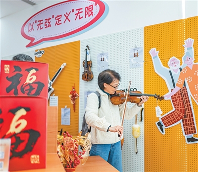 市民在上海银发商店试拉小提琴。