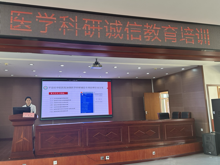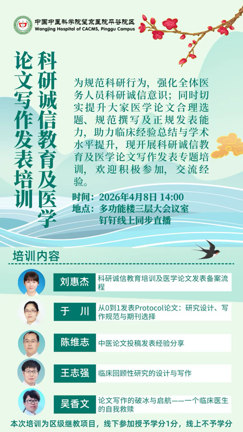 2026年4月8日下午,中国中医科学院望京医院平谷院区科研科组织的“科研诚信教育及医学论文写作发表培训”专题培训在多功能楼大会议室精彩开讲!本次培训采用线上线下同步直播的方式,让坚守工作岗位、无法离岗的同事们也能“云”端参会。全院医、技、护、药等岗位的科研骨干及青年学者踊跃参与,线上线下学习氛围浓厚。
