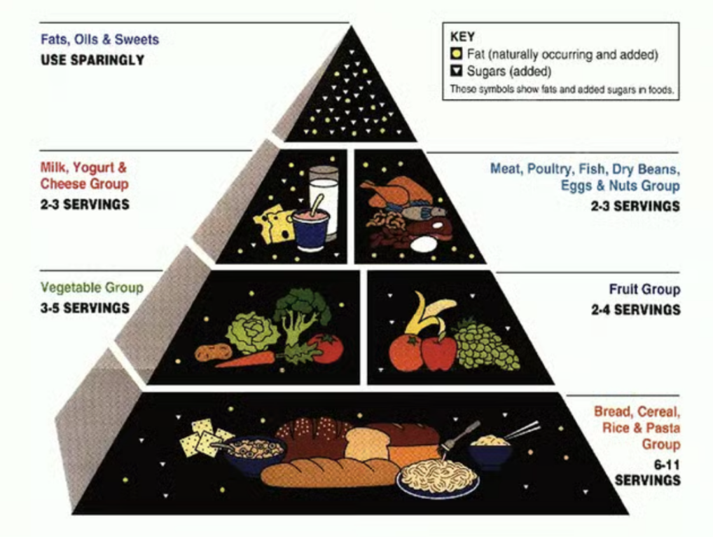 其老的食物金字塔推崇多吃高碳水、高度加工(高+精碳水化合物)的食物。