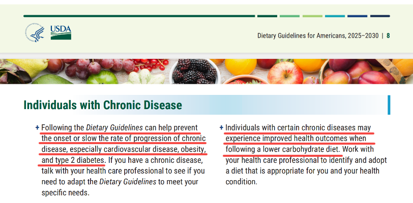 指南中特别提到:遵循膳食指南有助干预防慢性病的发生或减缓其进展,特别是心血管疾病、肥胖和2型糖尿病。患有特定慢性疾病的个体在遵循低碳水化合物饮食时,可能获得更佳的健康结果。