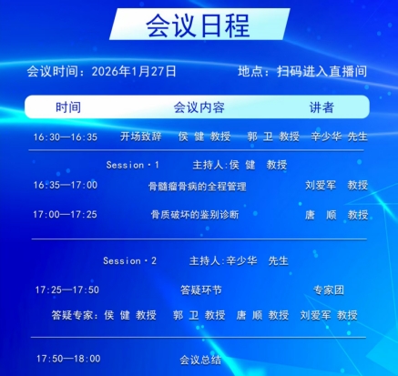 骨髓瘤是一种影响骨髓的恶性肿瘤,常伴有骨质破坏,可能导致骨痛、骨折甚至活动受限。为了让大家更好地了解疾病的发生、发展及治疗等要点,2026年1月27日(星期二)16:30–18:00特别举办“医患心连心”战胜骨髓瘤(六)——骨髓瘤与骨质破坏专题线上患教会。