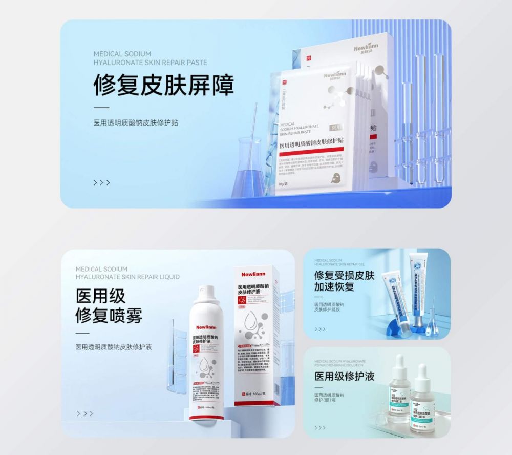 纽利安紧扣行业发展趋势与消费者护理需求,针对美容类器械、美护类器械、医学美容器械、护理类医用器械四大细分方向,完成了全场景、细分化的产品布局。在医学美容器械领域,品牌围绕医美术后肌肤护理需求,打造了医用重组III型人源化胶原蛋白修护系列、医用透明质酸钠皮肤修护系列等产品,适配医美术后肌肤的基础护理与屏障养护场景;在美容类器械与美护类器械领域,推出了分场景的面部、眼部专项护理产品,覆盖日常肌肤维稳、敏感肌护理、眼部舒缓等多个日常美容护理场景;在护理类医用器械领域,布局了医用硅酮疤痕护理系列产品,适配疤痕基础护理的专业需求。全系列产品均严格遵循医疗器械相关管理规范,完成合规备案与认证,实现了从专业医美场景到日常护理场景的全覆盖。