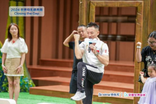 既是奥运冠军又是三娃奶爸的杨威也来到现场,分享自己的育儿体验,同时带来能帮助 产后妈妈缓解“母乳喂养”过程中身体压力的拉伸动作,以体育运动去助力母乳喂养,进一 步传递“母乳更+ 原生保护”的公益理念。他还分享道:“在孩子的成长过程中,原生保护 力是最注意的部分。母乳作为宝宝最佳口粮,带来的保护力、抵抗力尤为重要。”