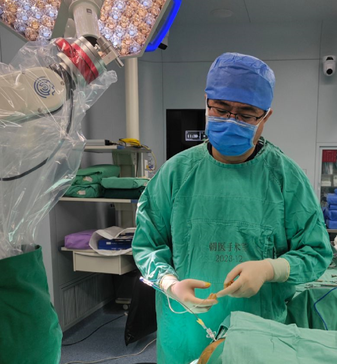 14日11时20分,手术正式启动。精准实施全麻后,神经外科手术机器人迅速导入术前电极植入设计数据完成注册。在刘长青主导下,依托机器人机械臂的毫米级导航,仅用时20余分钟即完成左额靶点定位、碘伏消毒、皮下烧灼、颅骨钻孔、硬膜穿刺及激光光纤套管精准置入等核心操作,随后以无菌敷料包扎固定。整个过程流畅高效,待患者麻醉苏醒拔除气管插管后,平稳转运至磁共振室进行下一步消融操作。